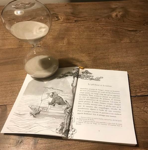 Notre amie Poète, Sylvie , prend la parole pour une vingtaines de Minutes, elle met en valeur un sablier très simple et d’une ligne pure. Elle a choisi un conte Japonais du 8ème Siècle. Une belle histoire d’amour entre un pécheur pauvre et la tortue merveilleuse. Je ne peux vous confier le texte trop long mais deux estampes vont vous plaire.
