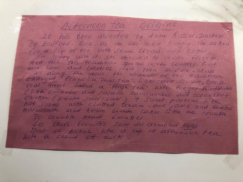 Il a été inventé par Anna Russell, duchesse de Bedford. Un jour, ayant un petit creux, elle demanda une tasse de thé avec du pain et du beurre. Ravie de cette idée, elle décida d’inviter des amis. C’est ainsi que cette tradition se répandit dans le pays, d’abord chez les lords et les bourgeois, puis dans la classe moyenne. Au fil des ans, les éléments de cette tradition ont évolué, passant d’un simple « low tea » (thé léger) à un véritable repas appelé « high tea » (thé de l’après-midi), composé de sandwichs (par exemple, des sandwichs au concombre et au saumon), de scones chauds avec du lait caillé, de confitures, du fameux poulet (poulet au sucre et au fromage frais), de pâtisseries sucrées comme la marmelade et de gâteaux maison comme le crumble. « To crumble » signifie émietter. Les brouilles sont des œufs émiettés. La plupart des Britanniques apprécient une tasse de thé de l’après-midi avec un chou au lait